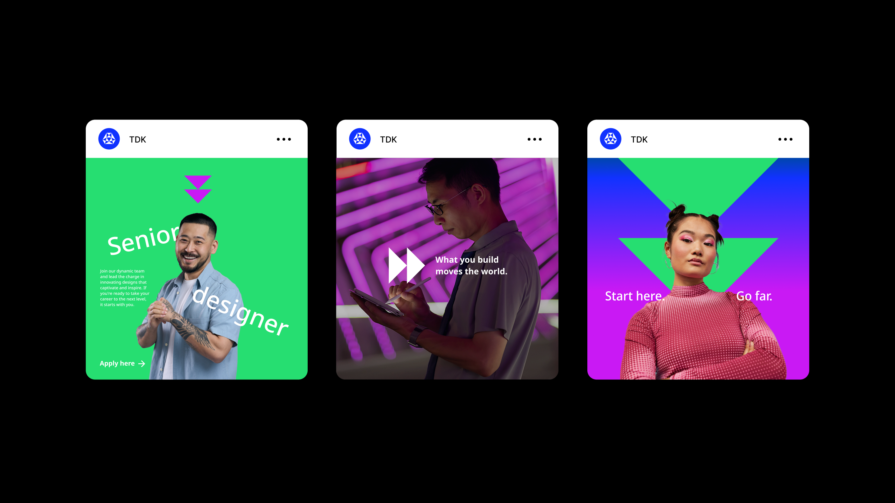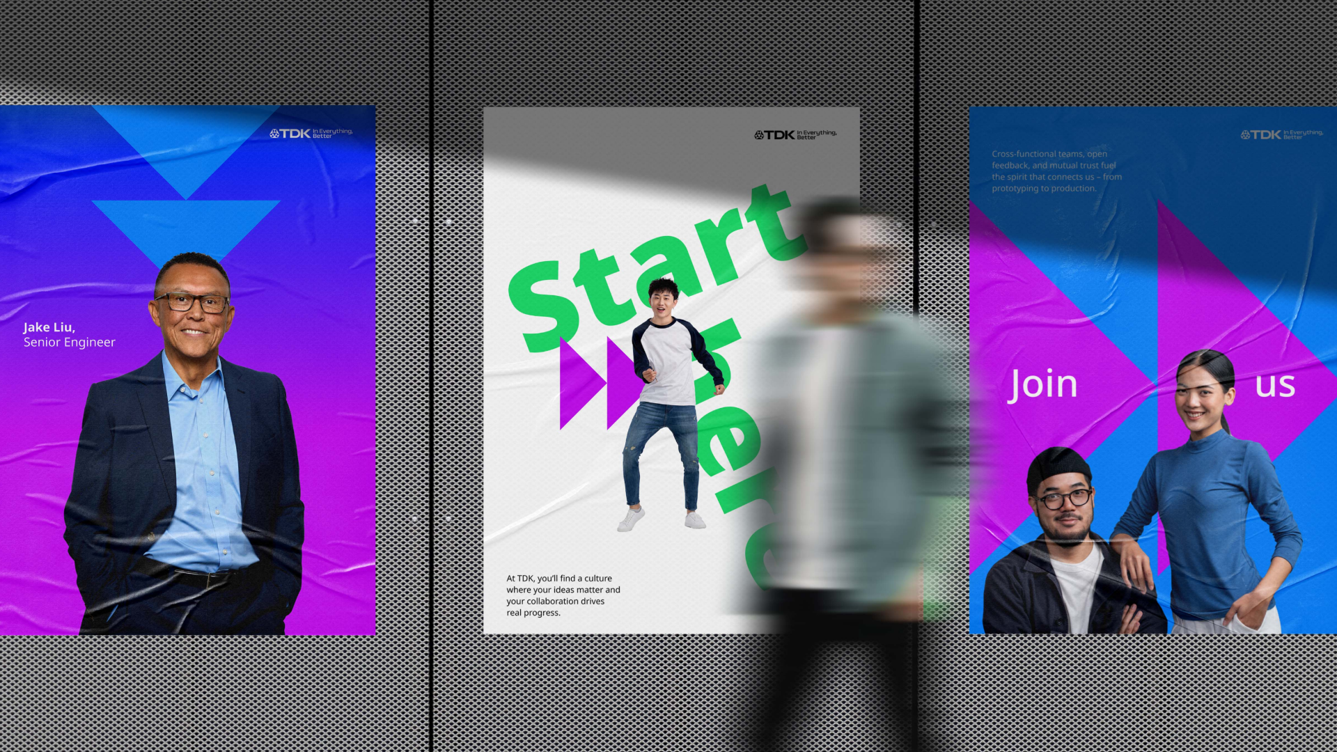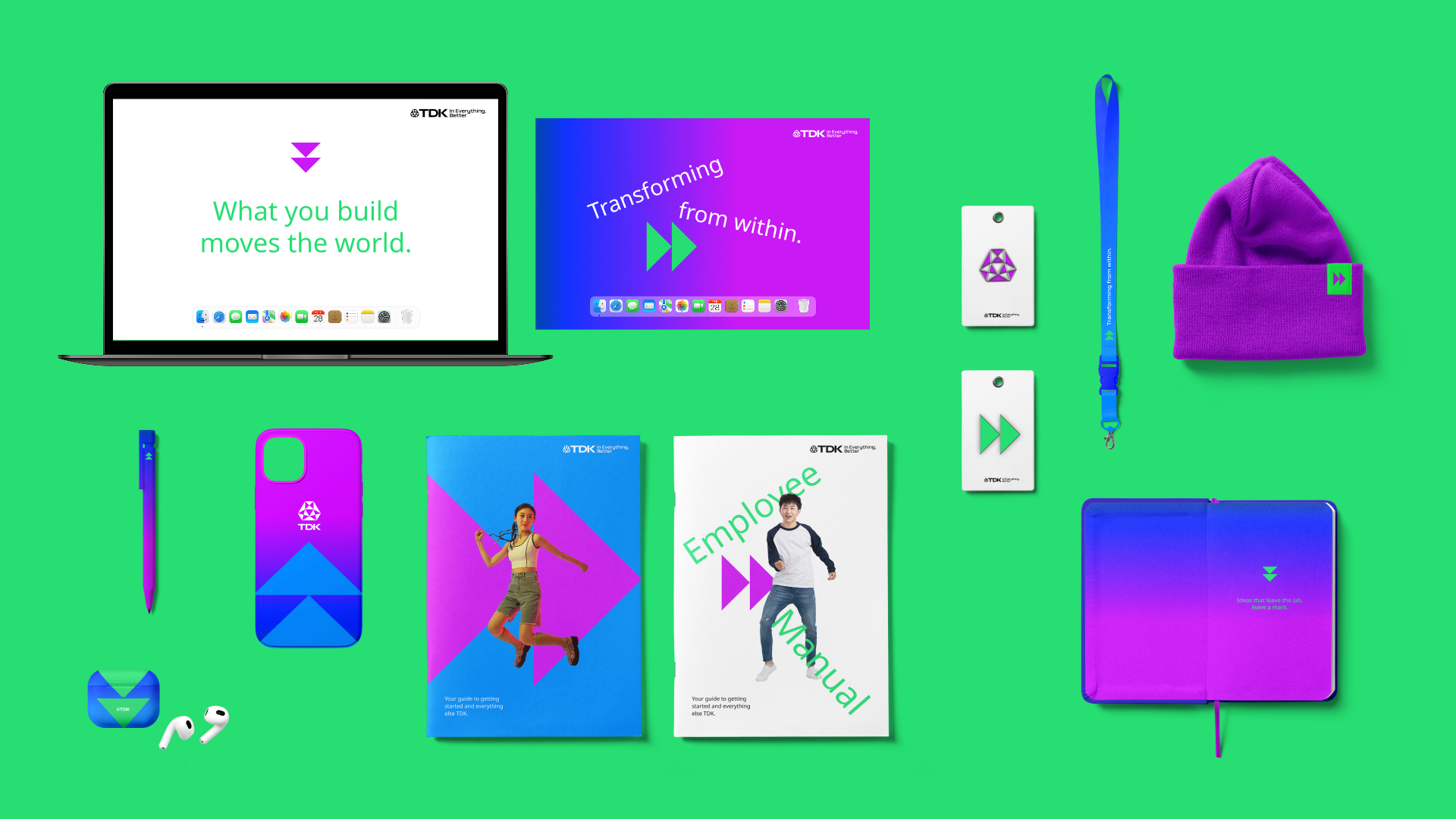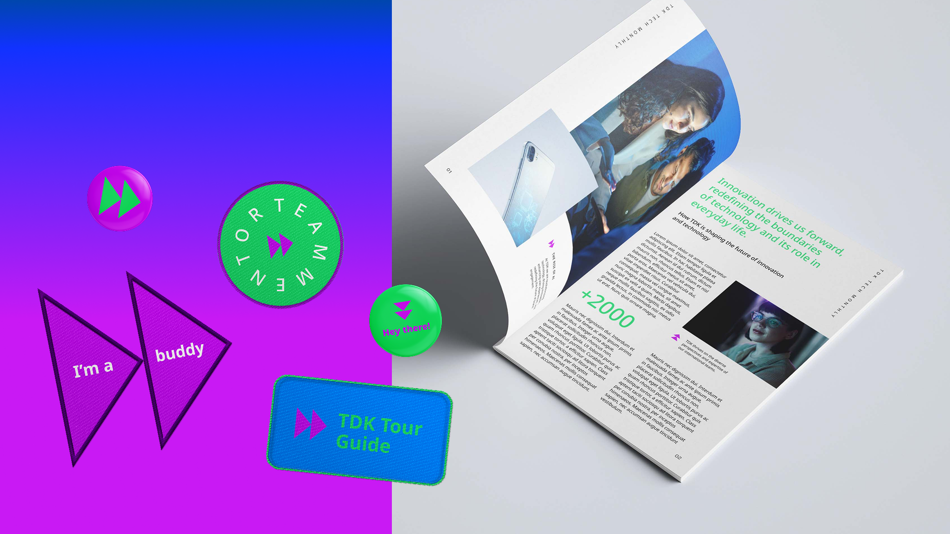 The Interbrand Tokyo team previously created the new brand and identity for TDK. Following this, Interbrand Cologne was tasked with creating the visual identity for TDK’s employer brand. Leveraging elements from the master brand, we designed a custom “Forward Double Triangle”, inspired by TDK's electronics heritage and symbolizing the company's future. We developed a bold and dynamic system focused on TDK’s employees, highlighting current team members while featuring playful and engaging layouts to attract prospective talent.